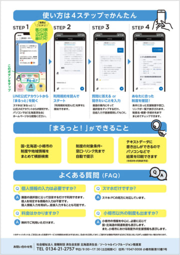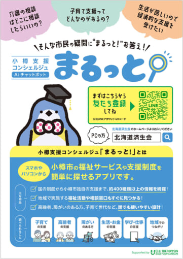 小樽支援コンシェルジュ「まるっと!」は、スマホやパソコンから小樽市の福祉サービスや独自の支援制度を簡単に探せるAiチャットボットアプリです。これにより、「どこに相談すればよいか分からない」「手続きが難しい」といった不安を解消し、より多くの方が安心して各種支援につながることが可能となりました。