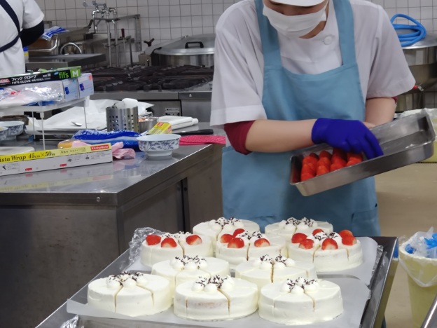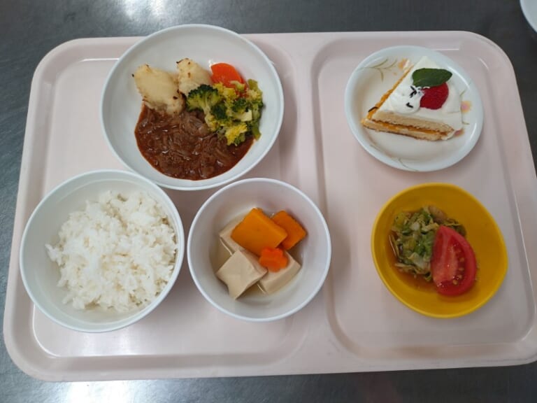 療養食の方には、砂糖を低カロリー甘味料に替え、フルーツや生クリームの量を調整した特別なケーキを別途用意。安全面と楽しさの両立に配慮しました。