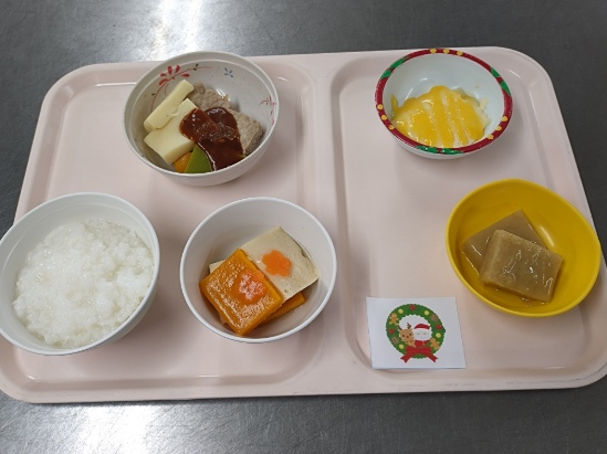 12月24日、〈山口〉湯田温泉病院厨房では調理師が年に一度のクリスマス行事食を、いつも以上に心を込めて調理しました。普段から療養食や食事形態への細やかな対応が多く多忙な中、この日は人員を増やし6人で、スタッフ一丸となって取り組みました。