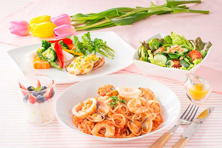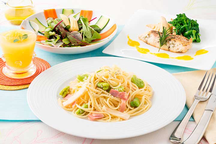 春色の彩り野菜が引き立てる 南部どりと盛岡冷麺パスタ