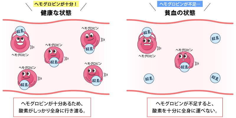 「貧血」は、血液中のヘモグロビン量が少なくなっている状態のことをいいます。ヘモグロビンは赤血球に含まれ、酸素を全身に運ぶ働きを持つタンパク質。ヘモグロビンが不足すると酸素を十分に運ぶことができず、全身への酸素供給が減ってしまった結果、体中の細胞が酸欠状態になります。