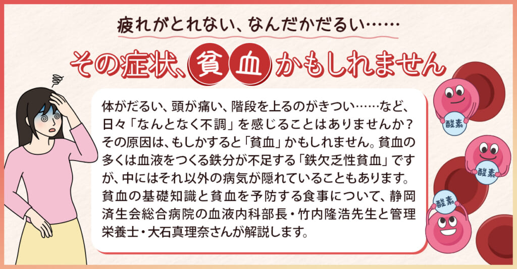 体がだるい、頭が痛い、階段を上るのがきつい……など、日々「なんとなく不調」を感じることはありませんか? その原因は、もしかすると「貧血」かもしれません。貧血の多くは血液をつくる鉄分が不足する「鉄欠乏性貧血」ですが、中にはそれ以外の病気が隠れていることもあります。貧血の基礎知識と予防、「貧血」を改善する食事について、静岡済生会総合病院の血液内科部長・竹内隆浩先生と管理栄養士・大石真理奈さんが解説します。