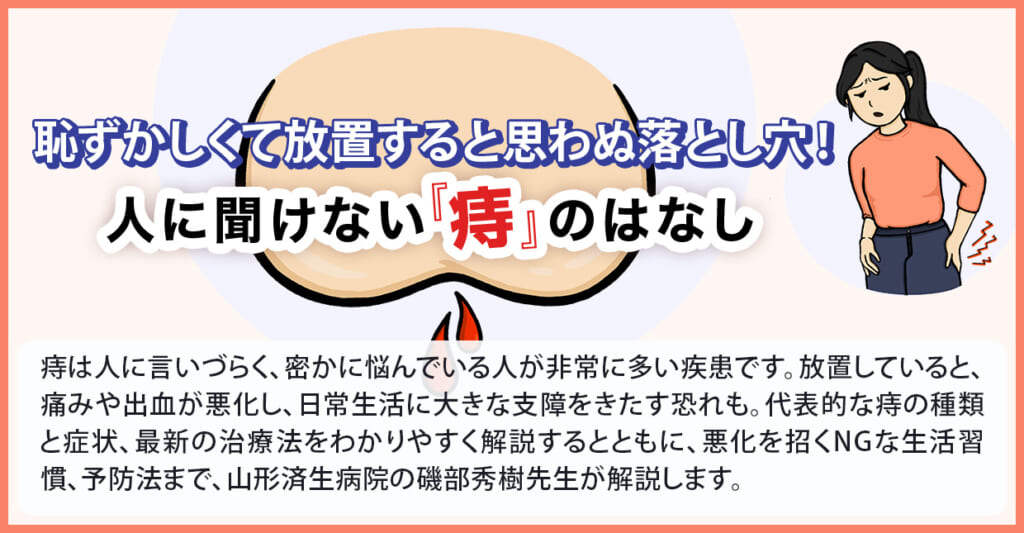 痔は人に言いづらく、密かに悩んでいる人が非常に多い疾患です。放置していると、痛みや出血が悪化し、日常生活に大きな支障をきたす恐れも。本企画では、代表的な痔の種類と症状、最新の治療法をわかりやすく解説するとともに、悪化を招くNGな生活習慣、予防法まで、山形済生病院の磯部秀樹先生が解説します。