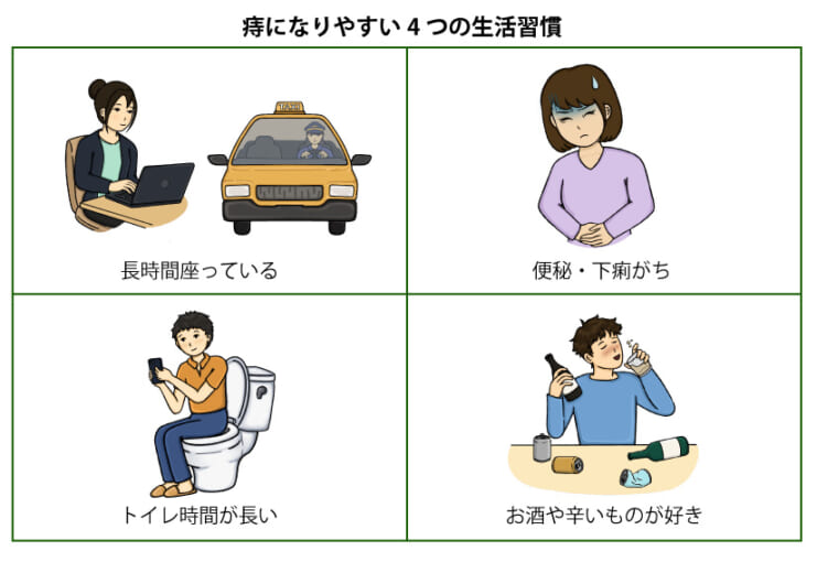 痔を引き起こす主な要因は、排便時などの「いきみ」。便秘だけでなく、排便回数が多いことで肛門に負担がかかることも一因であると考えられています。また、意外なところでいうと、仕事などで重い物を持つ人も無意識にいきんでいることが多いため注意が必要です。長距離を運転するドライバーやデスクワークが長時間に及ぶ人は、肛門付近がうっ血しやすく、いぼ痔(痔核)になりやすいといえます。