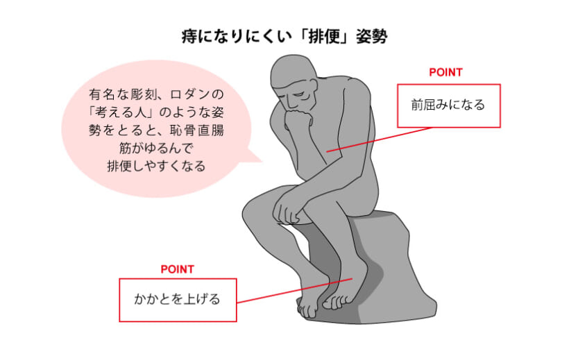 排便時には、便座に腰をかけて、かかとを少し上げ、前のめりになる姿勢がおすすめです。有名な彫刻作品の「考える人」のポーズをイメージするとわかりやすいでしょう。直腸の周りを囲っている恥骨直腸筋がゆるみ、直腸がまっすぐになる姿勢ですので、スムーズな排便を促してくれます。
