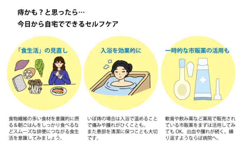 それから、湯船に入ることもおすすめです。内痔核の場合、あたたかなお風呂に浸かるだけで腫れや痛みが取れることもあります。