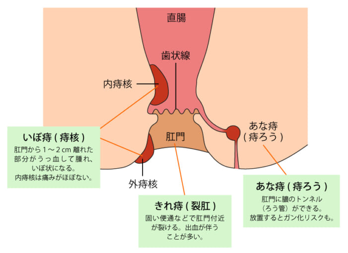 痔のお悩みで病院を受診することに抵抗を感じている方は多いですが、適切な治療が必要な、れっきとした肛門の病気です。いぼ痔、きれ痔、あな痔が「三大痔疾患」といわれています。