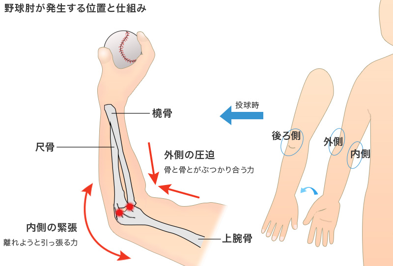 ボールを投げすぎることによって発生する肘の障害をまとめて「野球肘」といいます。ボールを投げる時や投げた後に肘が痛くなります。野球肘には①内側の障害、②外側の障害、③後ろ側の障害があります。肘を伸ばして手のひらを上に向けたときの小指側が内側、親指側が外側、手の甲側が後ろ側です(図)。いずれも、繰り返しボールを投げることによって肘に負担がかかり過ぎることが原因です。小中学生のときの障害が原因となり、高校生以後に肘を傷めることも少なくありません。
