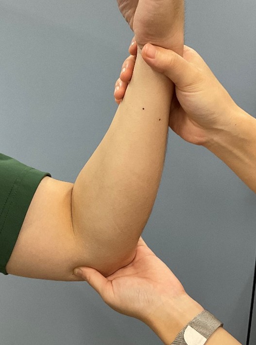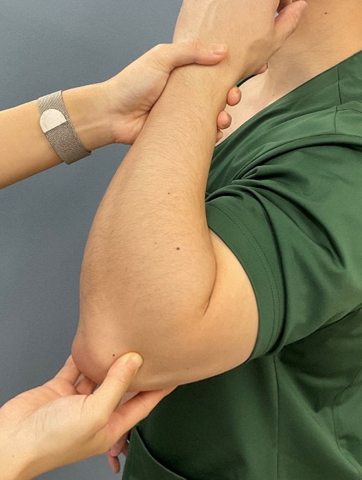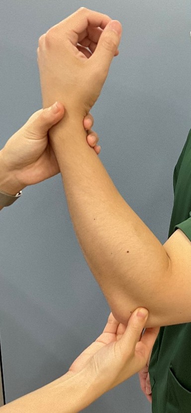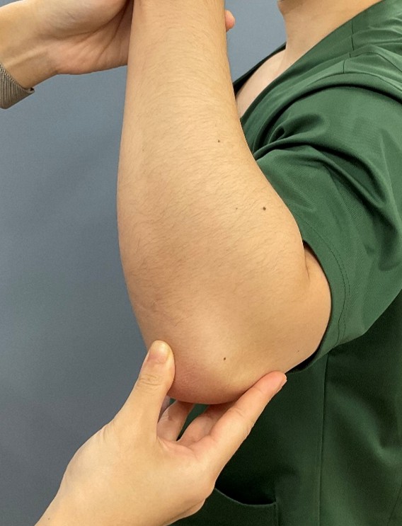 肘を触ったり押した際の違和感や痛み、腫れなどを左右で比較することで、痛めている箇所や進行具合を調べることができます。