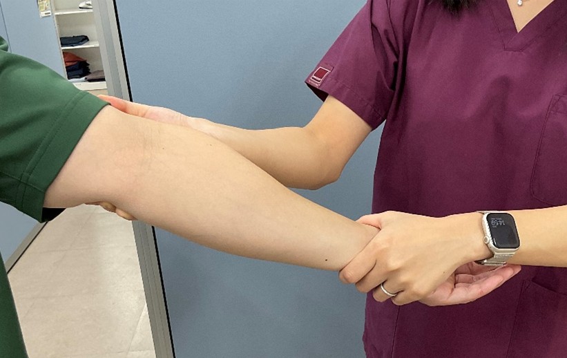 肘を触ったり押した際の違和感や痛み、腫れなどを左右で比較することで、痛めている箇所や進行具合を調べることができます。
