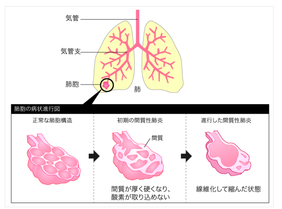 「呼吸」とは、吸った空気(吸気)を気管から続く気道を介して、末端の肺胞という小さな袋にまで運び、肺胞の周りにある「間質(かんしつ)」の中を流れる毛細血管中の血液に酸素を与えるための作業です。間質性肺炎とは、この間質にさまざまな原因による炎症が起こり、壁が厚く硬くなって(線維化)、血液中に酸素が取り込まれにくくなる病気です。症状としては、歩行やそのほか日常生活の中で身体を動かしているとき(労作時)に感じる息切れ、痰(たん)を伴わないせきなどが現れます。比較的ゆっくり進行する病気であるため、症状を自覚した段階ではかなり病気が進んでいることもあります。