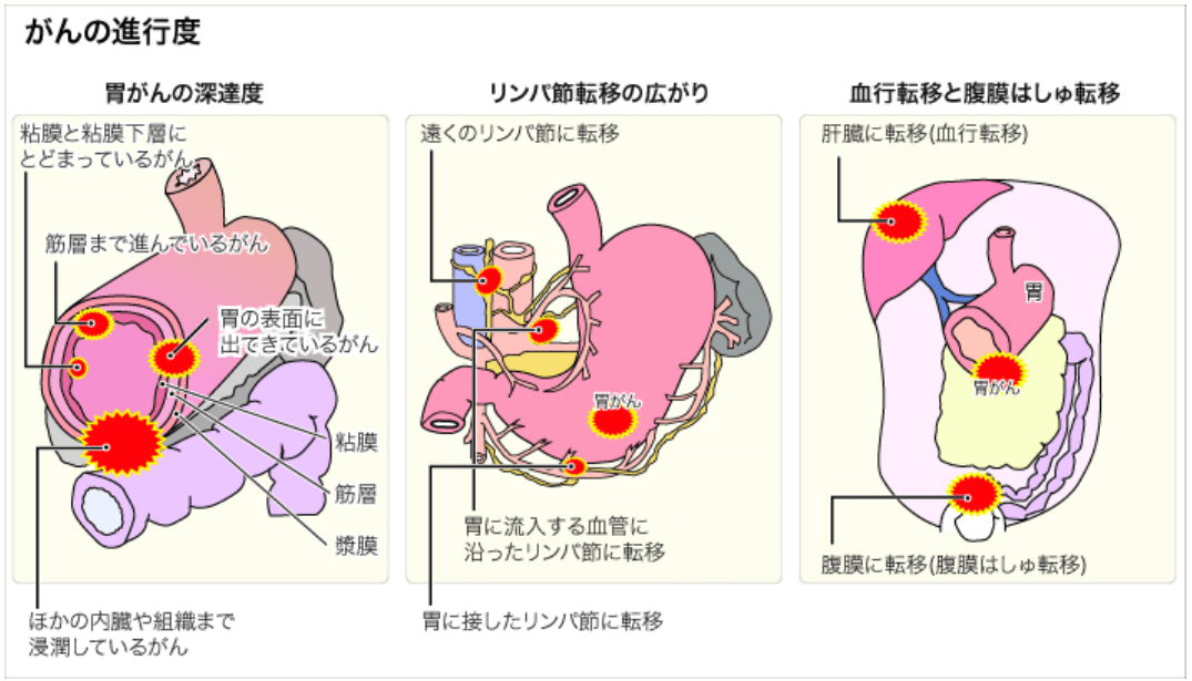 胃がんは、胃の粘膜から発生し、粘膜下層→筋層→漿膜下層(しょうまくかそう)→漿膜(しょうまく)と徐々に深く進行します。また、がん細胞がリンパ管や血管の中に入り込み、胃の周囲のリンパ節に転移したり肝臓・肺などの遠くの臓器に転移(血行転移)したりすることがあります。また、胃の壁を貫いて腹膜へと転移(腹膜播種=ふくまくはしゅ)することもあります。がんの広がりや転移の有無により、進行度はステージI~IVに分類され、治療方針が決定されます。なお、早期がんは粘膜または粘膜下層までにとどまるがんで、進行がんはそれより深く浸潤した状態です。粘膜下層まで浸潤した早期がんでも、約10~20%にリンパ節転移が認められます。