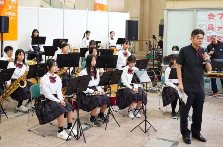 午前10時、吹田病院で島俊英病院長が開会挨拶。続いて地元中学校吹奏楽部の演奏によるオープニングセレモニーで幕を開け、コンサートや盲導犬パフォーマンスなどが行なわれました。JR吹田駅前特設ステージでは健康啓発BINGO大会に多くの市民が参加しました。