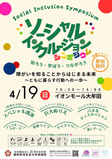 福岡県大牟田市にて、第4回済生会ソーシャルインクルージョンシンポジウムを開催します。シンポジウムでは、障害のある方やご家族、支援者、市民、行政の皆さまが一堂に会し、「インクルーシブ社会」をキーワードに、誰一人取り残されない社会の実現について考えます。