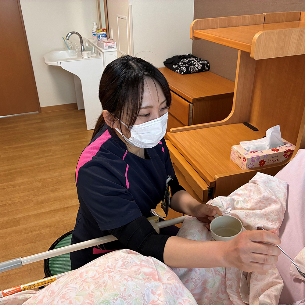 看護学校卒業後、済生会唐津病院に入職し、約5年間病棟で経験を積みました。老年期看護への関心から老健施設への異動を希望できたのも、多様な事業を展開し、一人ひとりのキャリアに寄り添ってくれる済生会だからこそだと感じています。老健施設での看取りケアでは、徹底したご本人・ご家族との対話を重視し、看護の本質を大切にしています。例えば、点滴チューブなどを自ら引き抜く患者さん。本人とご家族に思いを伺いながらチューブを再挿入せず、その方らしい食事と日々をサポートしたことがありました。その瞬間の満面の笑顔は忘れられず、今も私のやりがいです。患者さんの”らしさ”を守り続ける看護を心がけています。