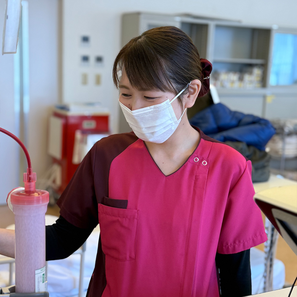 私が看護師として感じる一番の魅力は、患者さんの「ありがとう」という言葉に込められた思いを、毎日の中で直接受け取れることです。透析治療が安全に終わった後、「今日もありがとう。またよろしくね」と声をかけていただける瞬間、患者さんの支えとなれたことが実感でき心が温かくなります。体調が急変した患者さんに寄り添い、意識が戻った際に「助かった、ありがとう」と言ってもらえたときには、看護の力が誰かの命や安心に直結していることを深く実感します。患者さんに寄り添い、力になれるのが看護の魅力です。