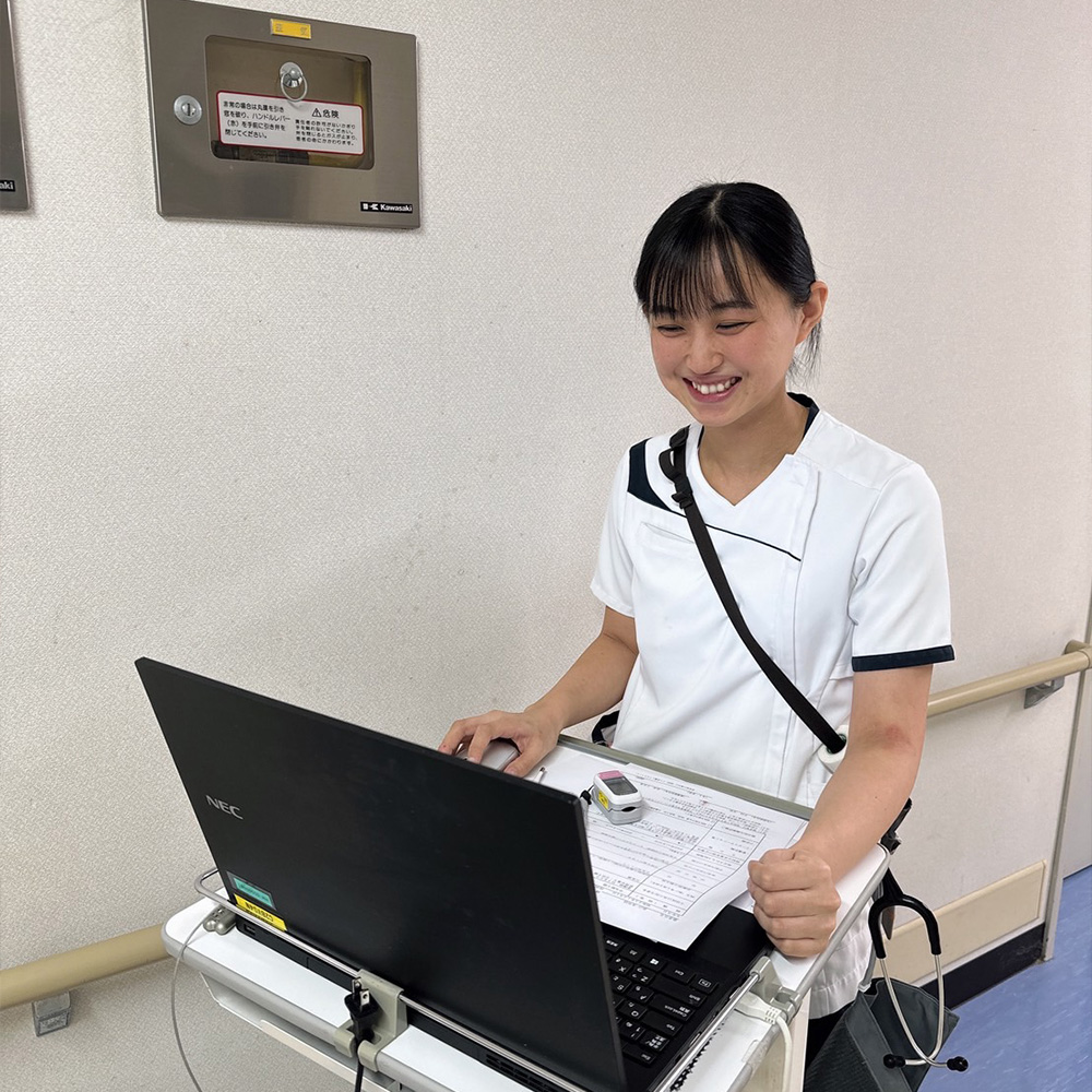 当院では新人看護師が安心して成長できる環境を大切にしています。基礎看護技術の集合研修から始まり、部署配属後も月1回の育成ミーティングで病棟管理者や教育担当者が進捗を共有し、全員で新人を支えています。私も実地指導者を経験し、後輩が自信を持って成長していく姿に大きなやりがいを感じています。困ったときには自然と声を掛け合える温かい職場なので、新人6人が誰一人欠けることなく安心して働けています。今後も新人が安心して学び、互いに成長を喜び合える職場づくりに力を注いでいきたいです。