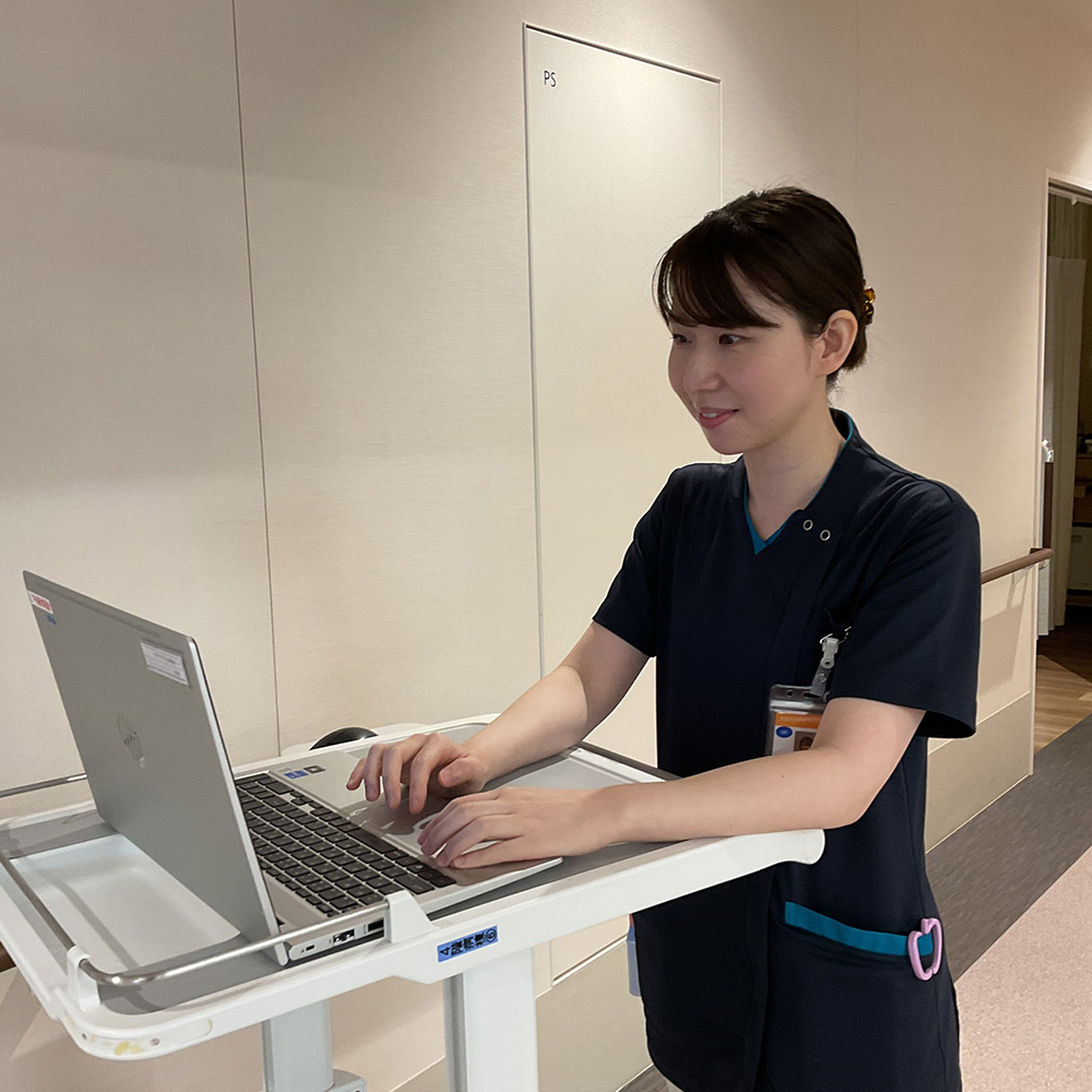私は神経内科病棟で脳卒中の患者さんと向き合う中で、後遺症を抱えた方々が自分らしい生活を再構築することの難しさを強く感じてきました。特に高次脳機能障害は外見から分かりにくく、たとえ身体機能の回復が順調でも、社会復帰には多くの壁があります。このような患者さんやご家族の力になりたいと考え、「脳卒中看護認定看護師」の資格を取得しました。現在は回復期病院で、より「その人らしさ」を支えられる看護を実践しています。患者さんとの関わり方にとまどうこともありますが、患者さん一人ひとりの思いに丁寧に寄り添い、スタッフが幅広く理解を深められるよう定期的な勉強会も行なっています。