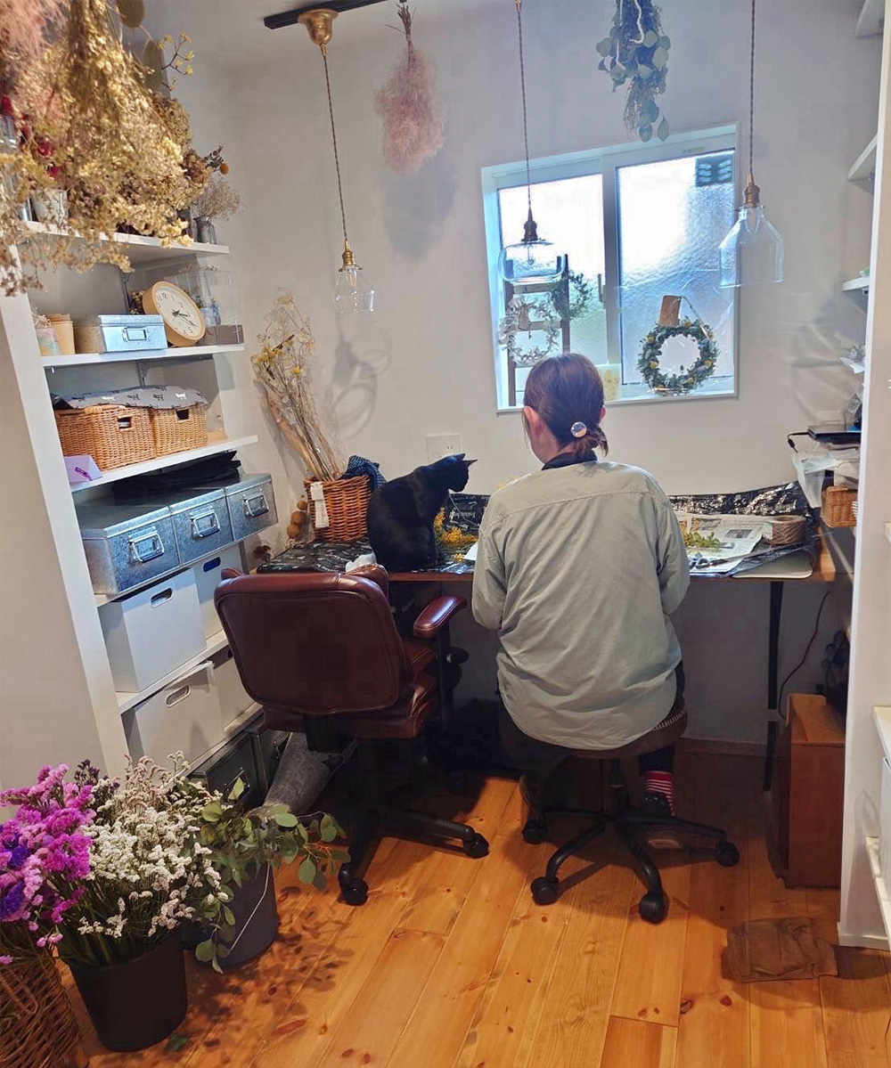 休日はリース作りとドライブを楽しんでいます。手づくりのリースを眺めながら、家族や猫とゆったり過ごす時間は心がほっと和みます。