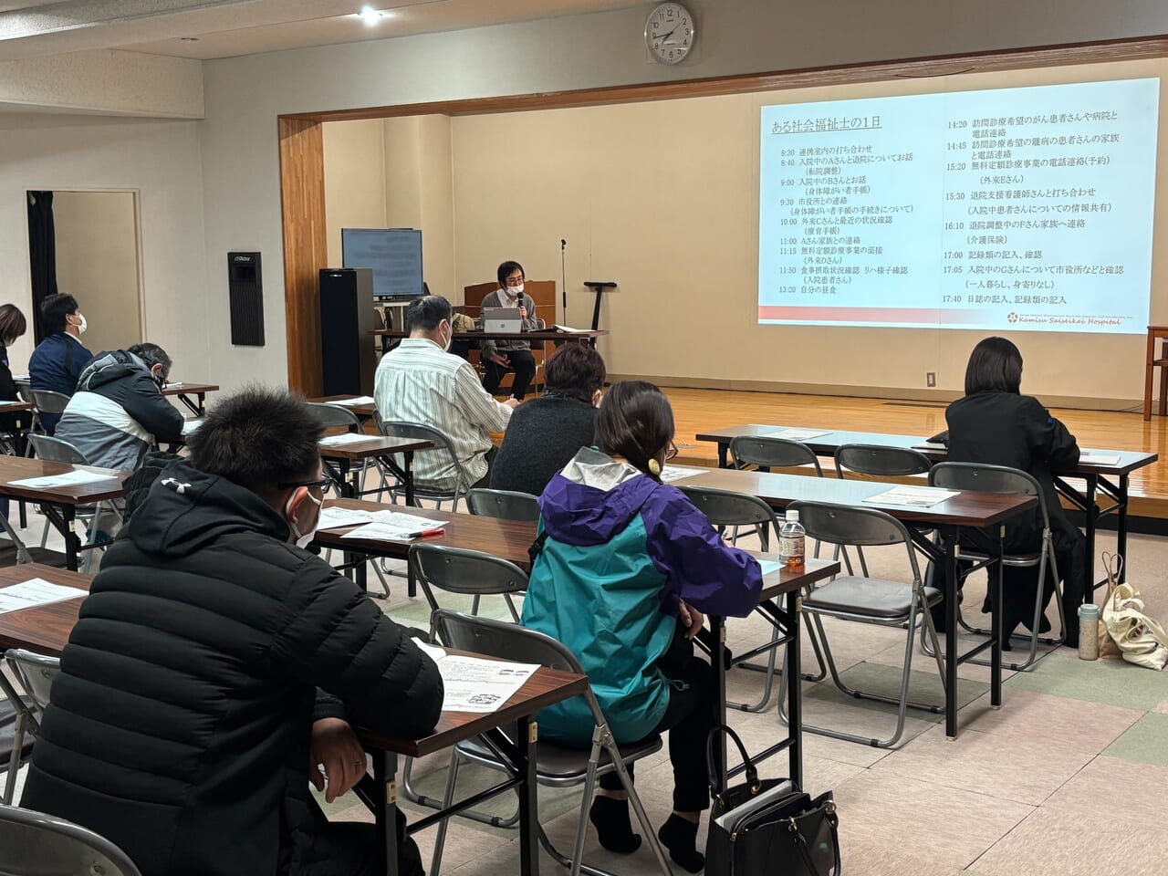 毎月開催される勉強会の今回のテーマは「医療ソーシャルワーカーを知っていますか?」。神田さんが社会福祉士の役割や普段の業務で心掛けていることなどについて話しました。