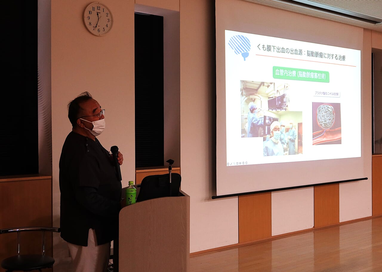 また、研修ホールでは脳神経外科・久保道也医師による講演会「脳卒中の予防について」を実施し、約30人が聴講しました。講演会では脳卒中の予防には高血圧症の管理が重要であり、日常生活で気を付けると良いポイントを分かりやすく説明しました。