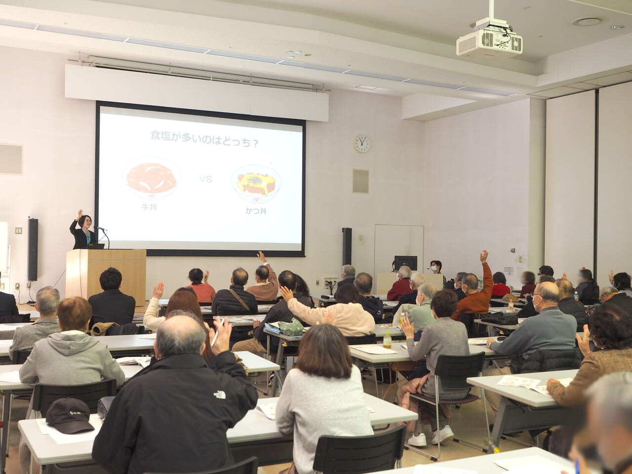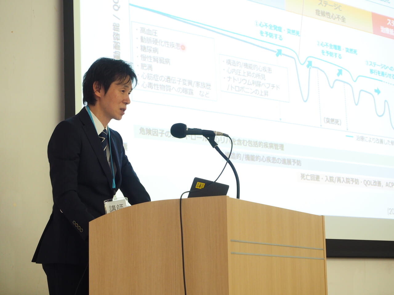 今回のテーマは「心不全にならない、増悪させない」。循環器内科・鈴木友康医師が心臓の基礎知識や心不全についての説明、予防方法など幅広い内容で講演を行ないました。続いて、看護師が心臓リハビリテーションの説明や自宅でできる運動の紹介、管理栄養士がクイズを交えながら普段の食事に関する塩分の知識や減塩のポイントを解説しました。