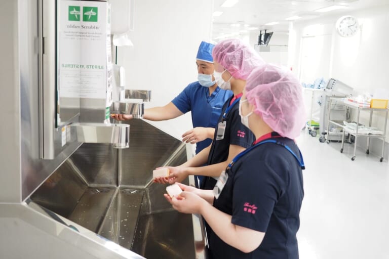 〈大阪〉富田林病院職員と同じユニホームを着用し、実際の臨床現場を経験してもらいました。参加者からは「病室で患者さんと話すなど良い経験ができた」「救急外来で体験した心電図やストレッチャーの操作が印象に残った」「手術室で手袋をつけるのが難しかった。ガウンは2人で協力して着るということも知れて、とても良い経験になった」との感想が寄せられました。