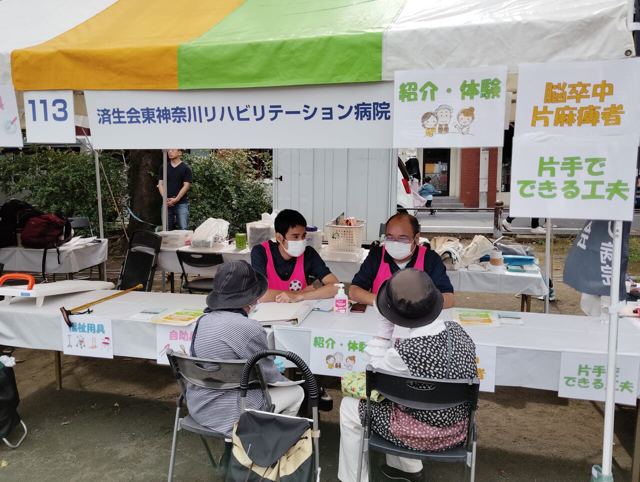 10月12日の令和7年度神奈川区民まつりに東神奈川リハビリテーション病院がブース出店し、作業療法士2人、事務員3人の計5人がスタッフとして参加しました。