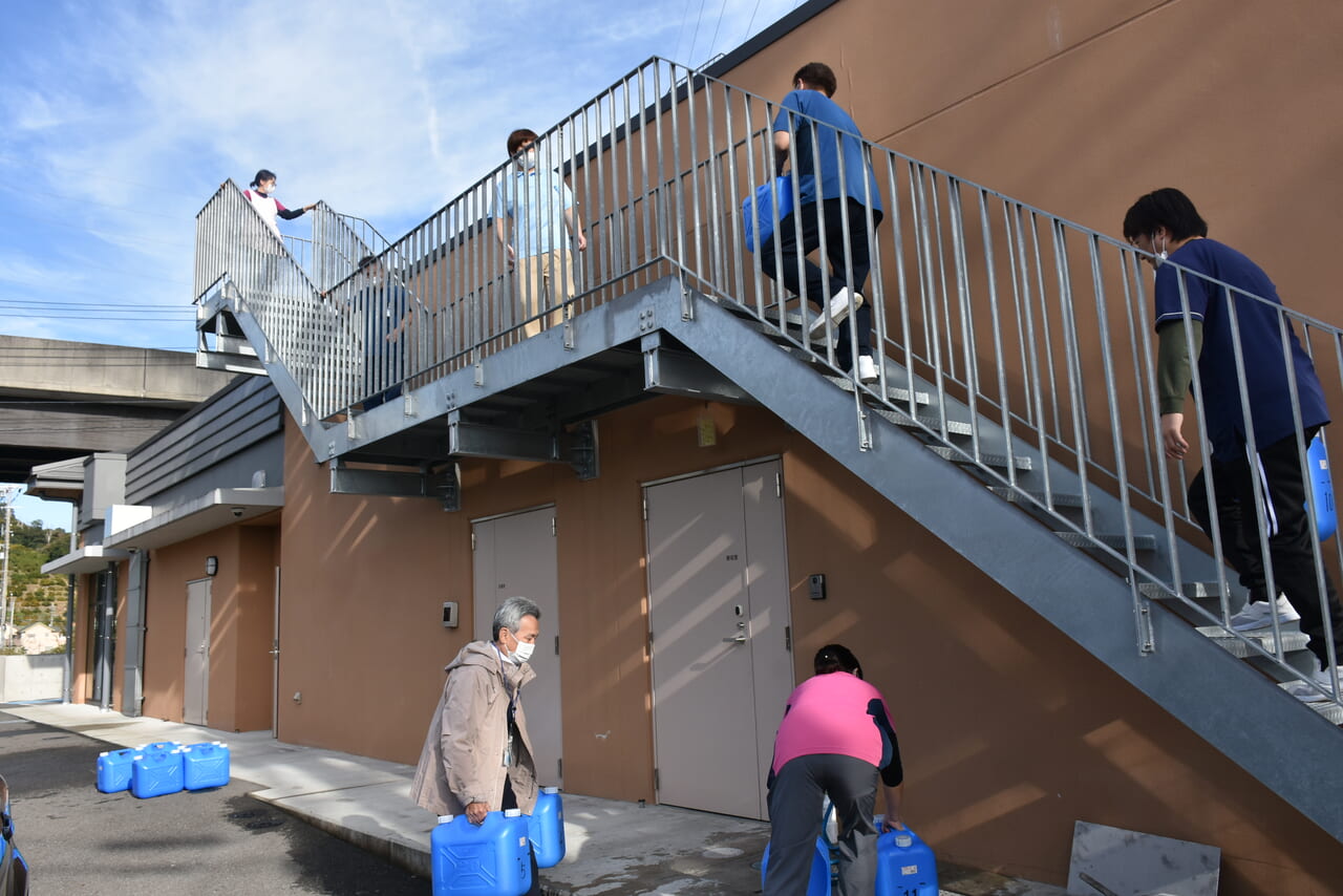 今回はぶっつけ本番で、20リットルのポリタンクを使用しましたが、適切な水量が分からず手探りでのスタートとなりました。実際にやってみると、満タンでは重すぎて運べないことが判明。7割程度が適量であると分かりました。最終的に職員12人が連携し、非常階段を使ったリレーによって、約30分で水を張り終えることができました。