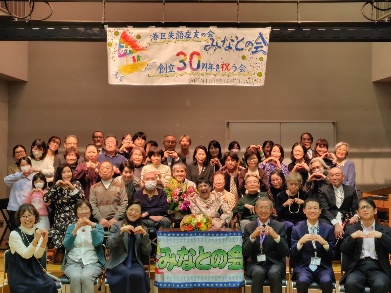 11月22日、ヒューマンぷらざで港区失語症友の会「みなとの会」の創立30周年を祝う会が開催され、来賓として港区区長、港区障害者福祉課長並びに障害者支援係長、障害保健福祉センター長、社会福祉協議会事務局長も出席し約60人が来場しました。同会は、港区民で失語症に悩む人たちとその家族やサポーター、医療従事者、失語症者向け意思疎通支援者によるピアサポートグループです。