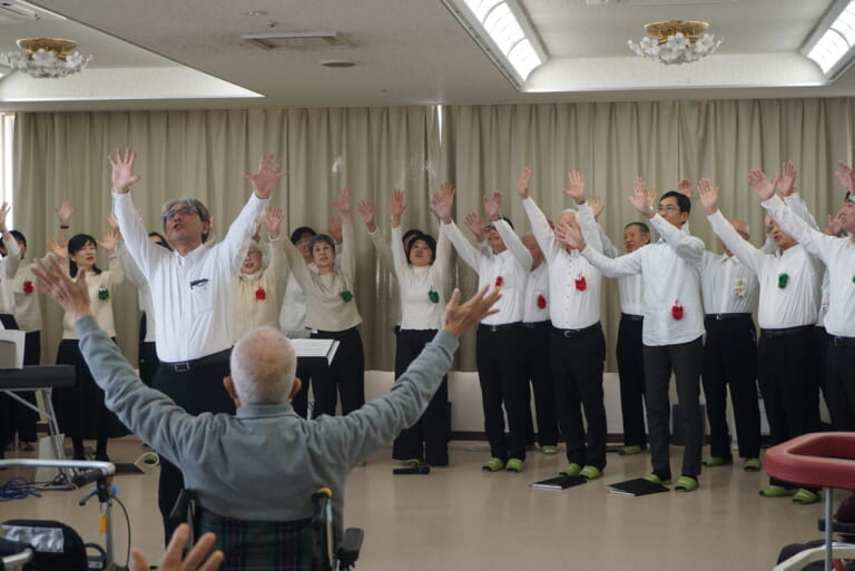 総勢21人の団員の皆さんが季節の唱歌やジブリの曲、昭和歌謡とさまざまなジャンルの楽曲を披露。やなせたかしさん作詞の「手のひらを太陽に」の振り付けを交えた合唱は、参加者の皆さんと体を動かしながらの楽しいプログラムとなり、会場は笑顔と活気に包まれました。また、電子リコーダーの演奏が織りなすジブリの世界観や、なじみのある歌の数々に、皆さん引き込まれていました。美しい歌声に対して、利用者の皆さんからは「すばらしい!」と歓声が上がり、会場は大変盛り上がりました。