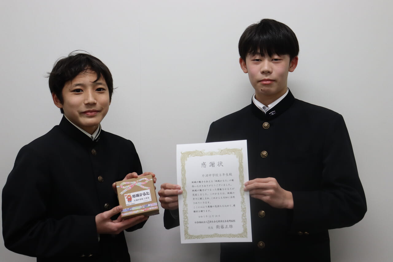 12月18日、片淵中学校3年生の代表2人から「地域かるた」をいただきました!