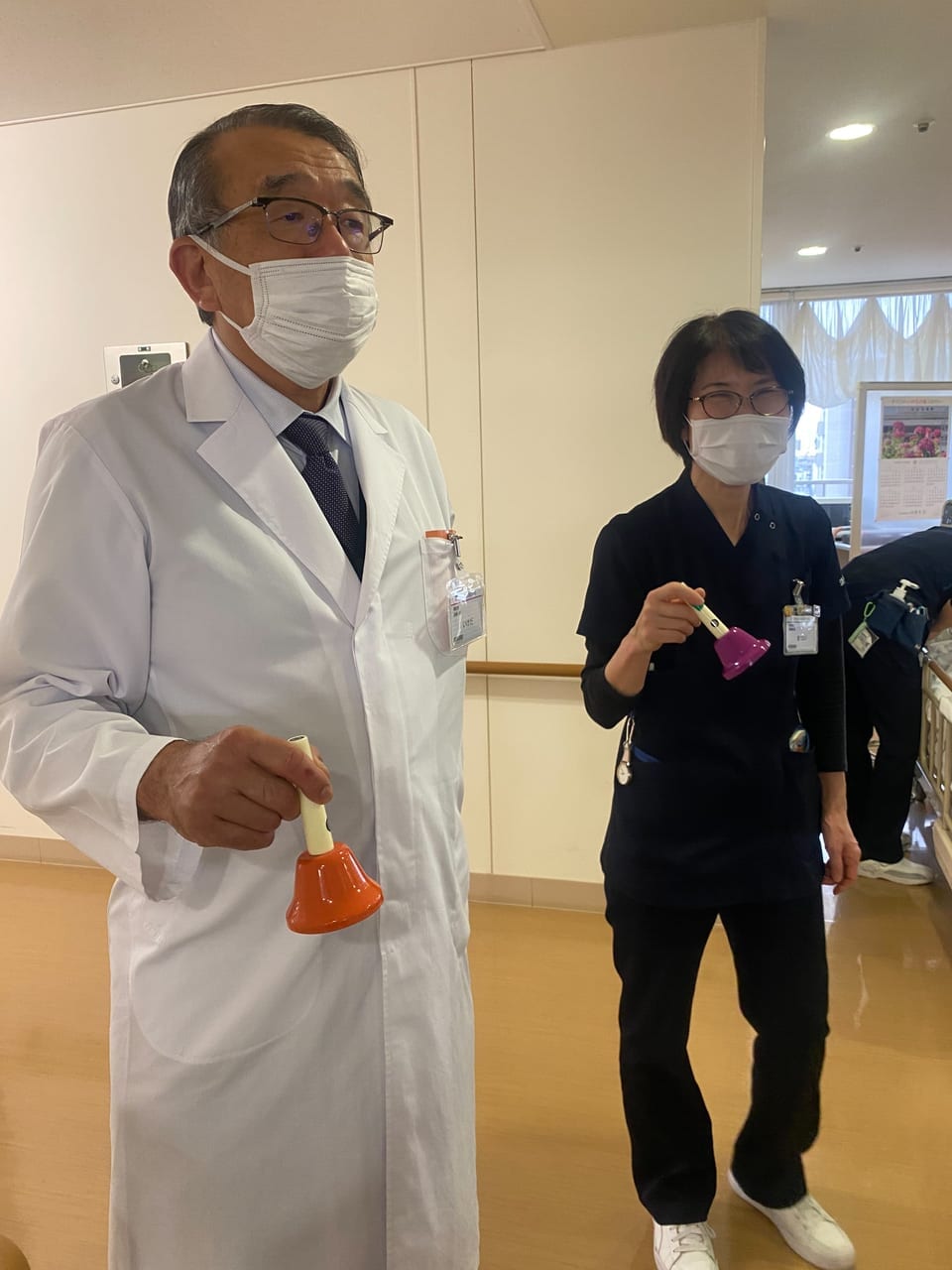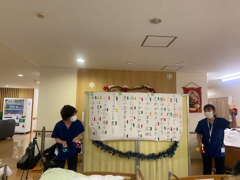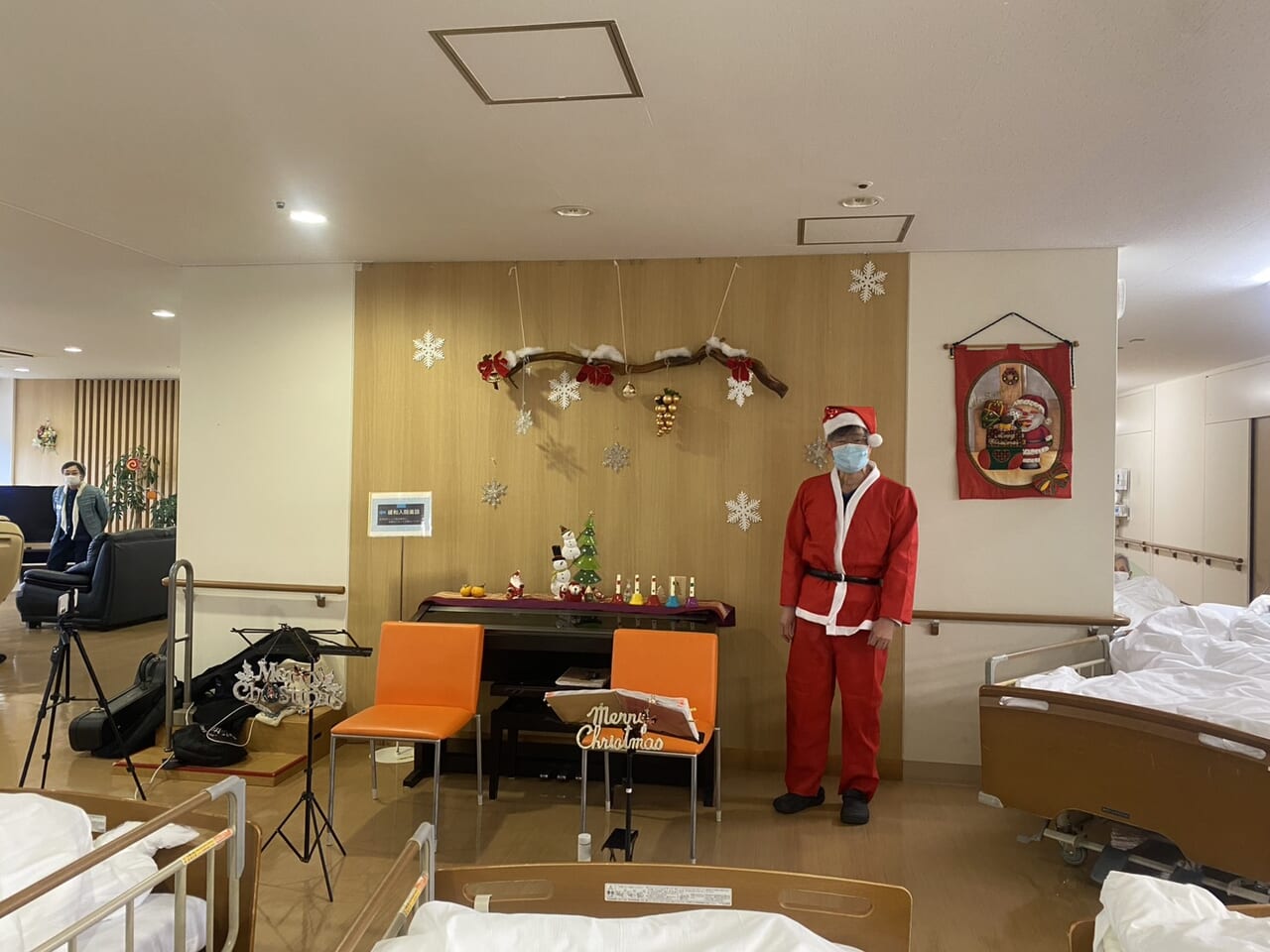 昨年8月に再開した緩和ケア病棟で、12月24日に4年ぶりのクリスマス会を開催しました。当日はボランティア2人、患者さんとご家族、清水敦哉緩和ケアセンター長、清水美恵医師、病棟スタッフを含め総勢40人が集いました。