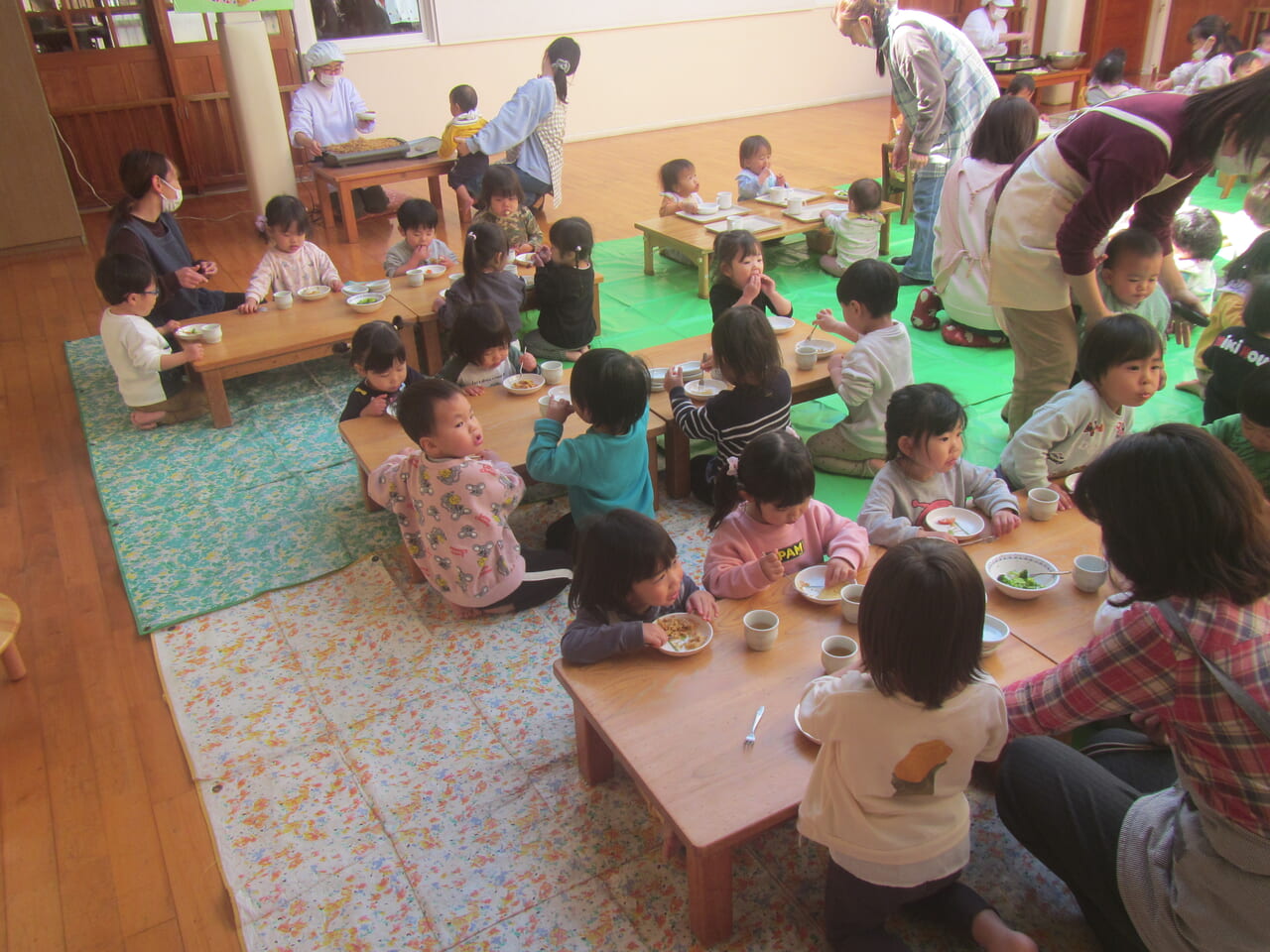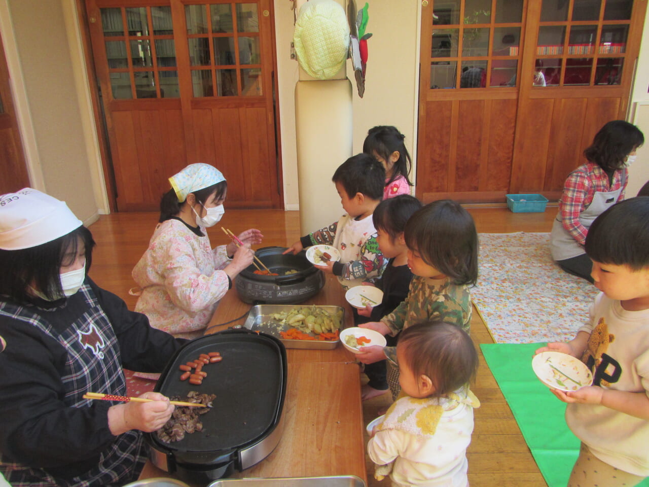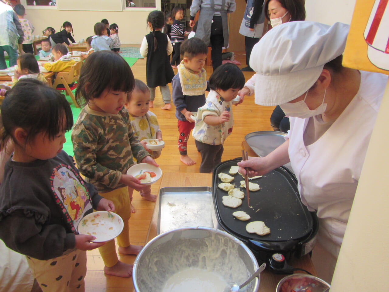 取りに来た子どもに声を掛けながらお皿に乗せ、落とさないように席に戻って食べていました。自分の食べたいものを何回もおかわりに行き、ホットプレートに山盛りあった焼きそばは売り切れ。ホットケーキもすべてなくなるほど、みんなおなかいっぱい食べていました。