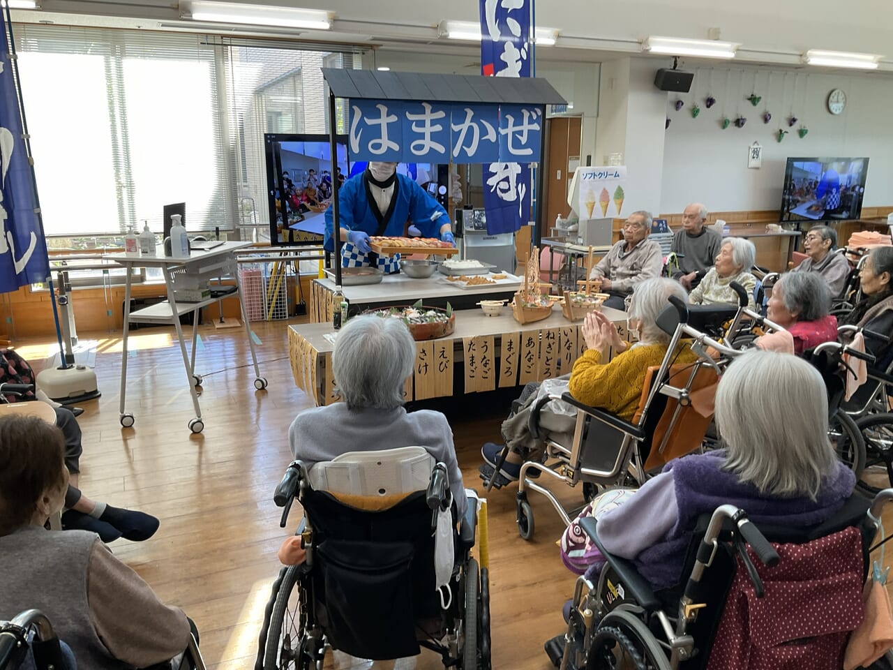 11月20日、〈鳥取〉老健はまかぜの入所フロアで「にぎり寿司イベント」を開催し、入所者さんと職員合わせて約50人が参加しました。