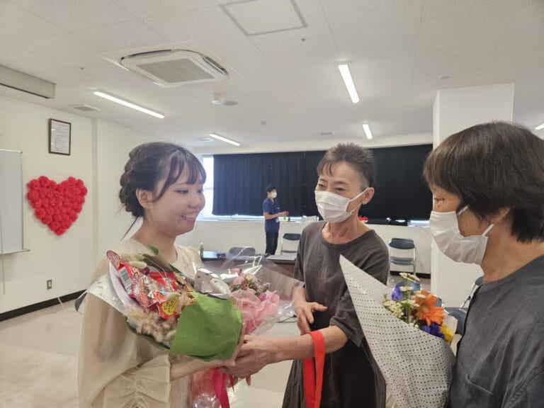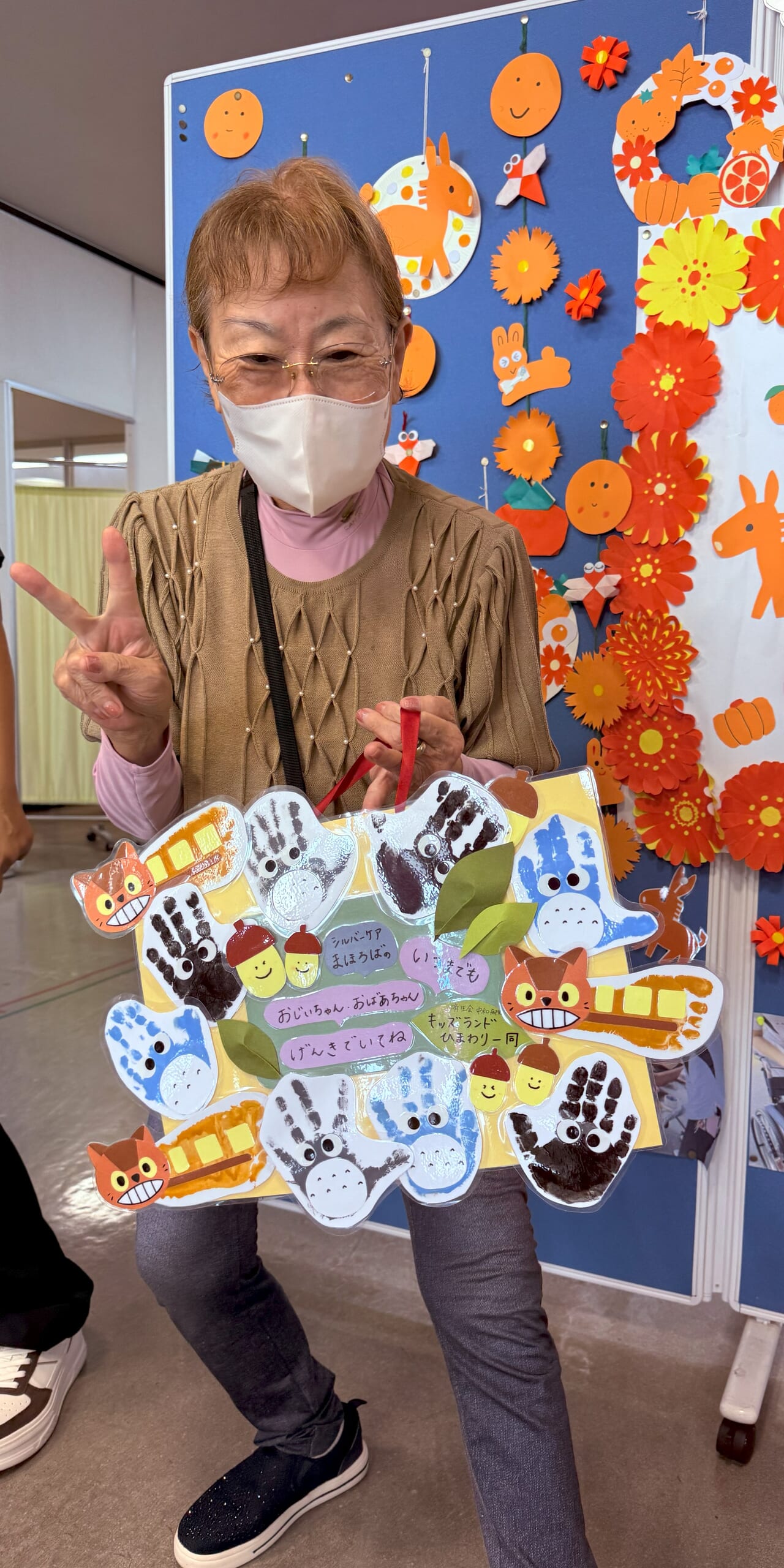 作品を受け取った利用者さんは「かわいいね、元気が出たよ!」「わあ! ありがとう」とピースをして喜びを表現。子どもたちは少し照れながらもうれしそうな表情を見せていました。
