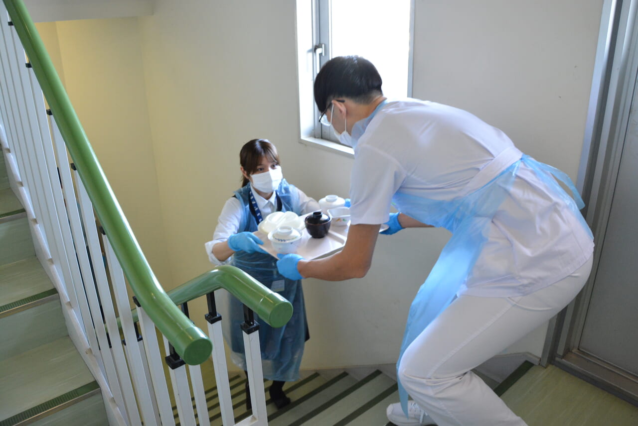 昨年元日の能登半島地震発生時、新潟病院では給食用を含むエレベーター全機が停止。病棟内に配膳車を運び入れることができず、当院のDMATや各部署職員の協力を得て、当日の夕食をリレー方式で配膳しました。