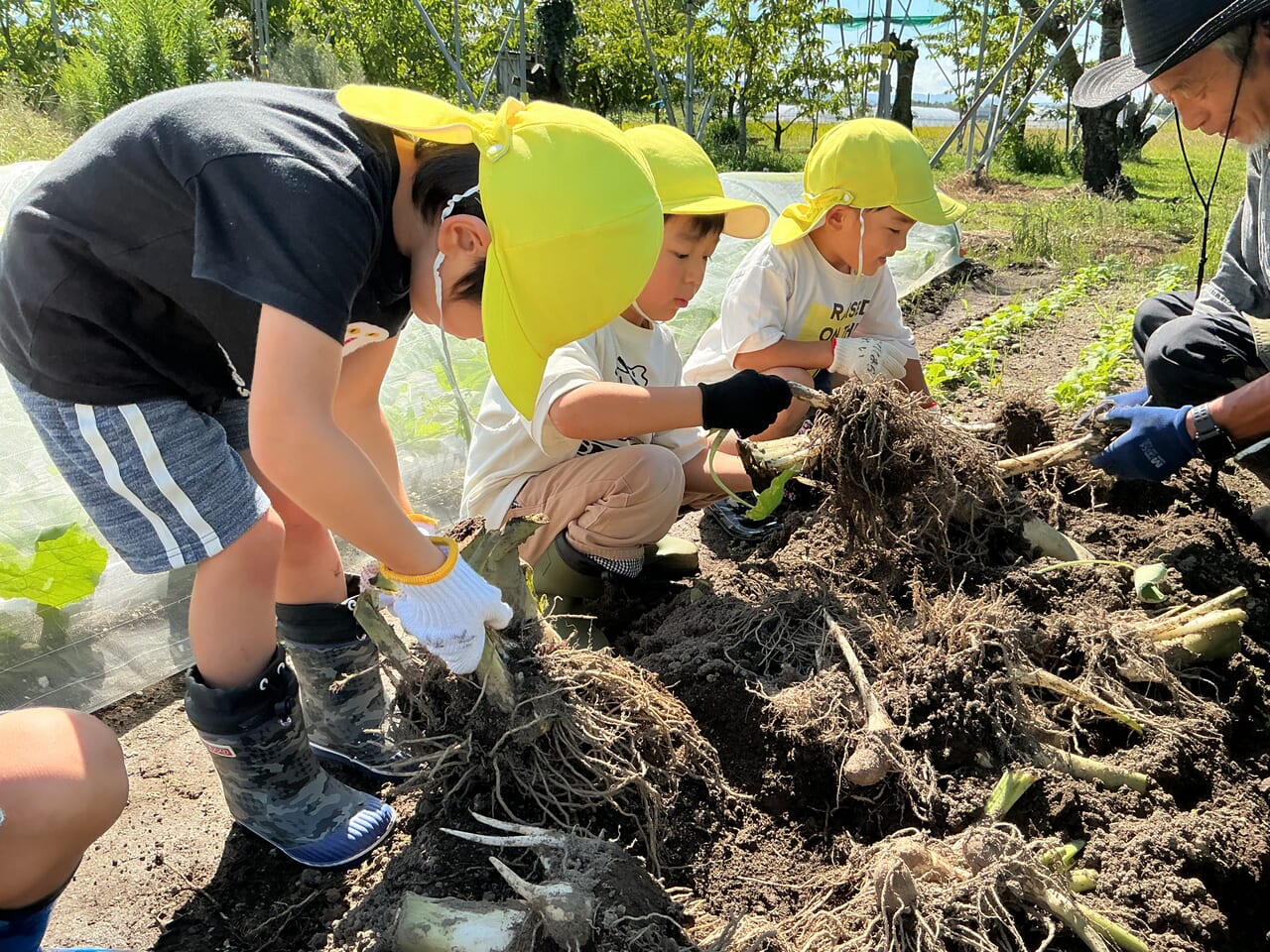 園児たちはバスに乗って、ワクワクした様子で出発。畑に着くと収穫の仕方をしっかり聞いて、親芋から一つひとつ丁寧に子芋を取りました。