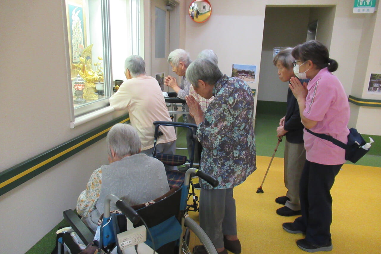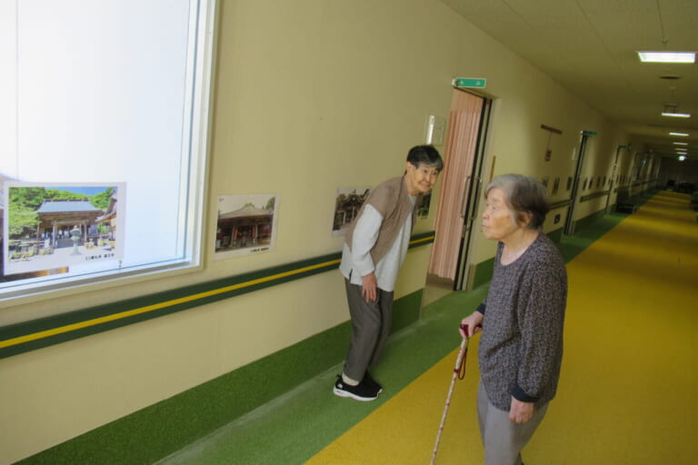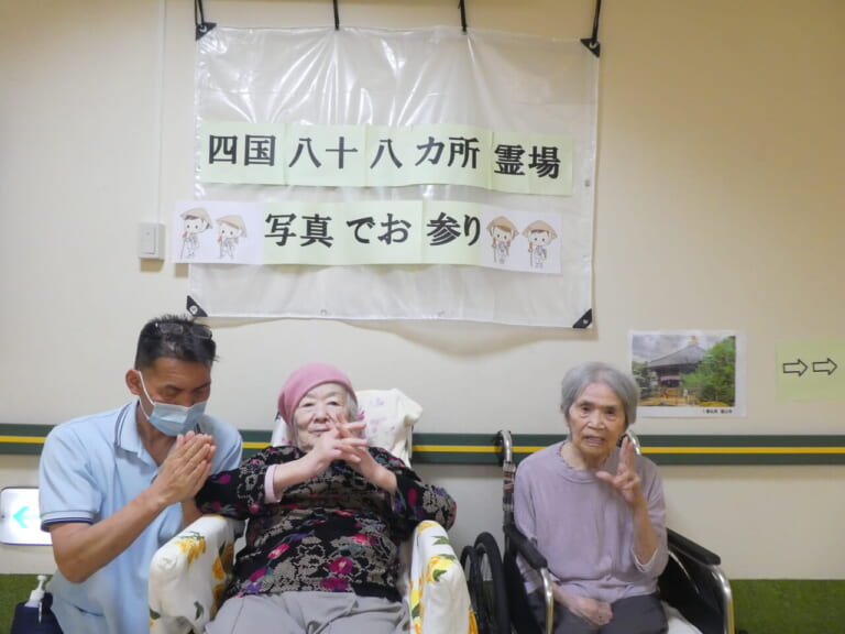 廊下の壁の端から各霊場の写真を順番に掲示し、最終地点にお釈迦(しゃか)様の像と鈴を設置。実際に霊場を巡るように利用者さんたちが毎日“お参り”に励んでいる様子は、微笑(ほほえ)ましくも心温まる光景です。お参りが日課となり、適度な運動につながる効果も。また、お参りしながら「ここ行った」「ここは知らない」など思い出を語り合う場面も見られ、新たな交流が生まれています。
