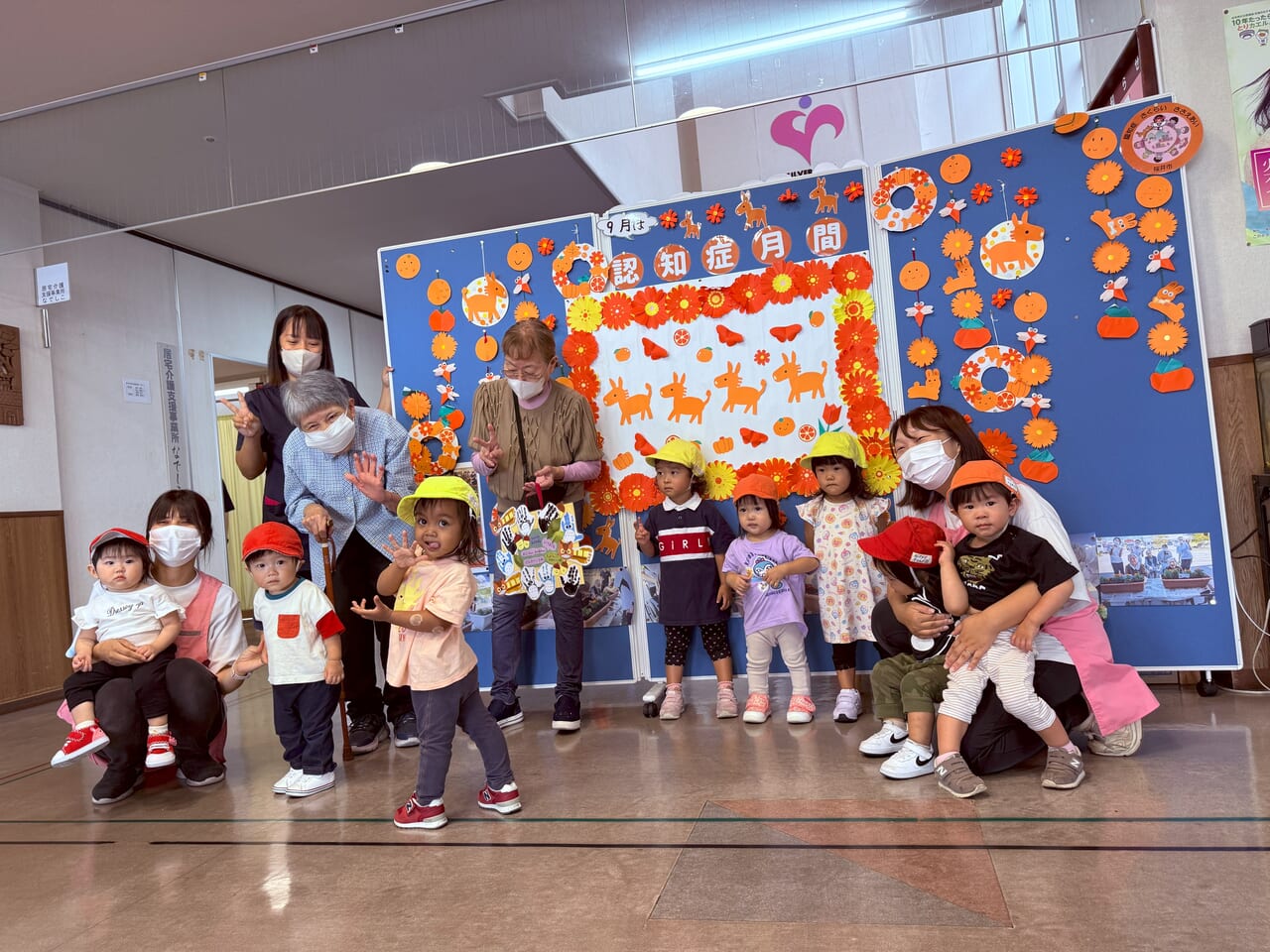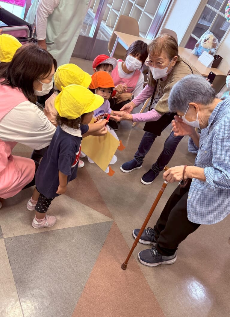 9月26日、〈奈良〉中和病院の院内保育所「キッズランドひまわり」の子どもたち9人が敬老の日のプレゼントを持って、併設の〈奈良〉老健シルバーケアまほろばを訪問しました。