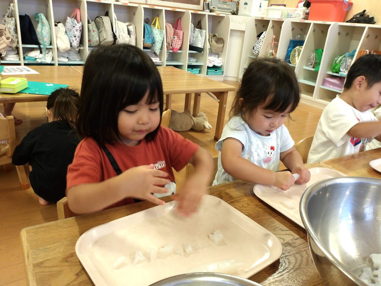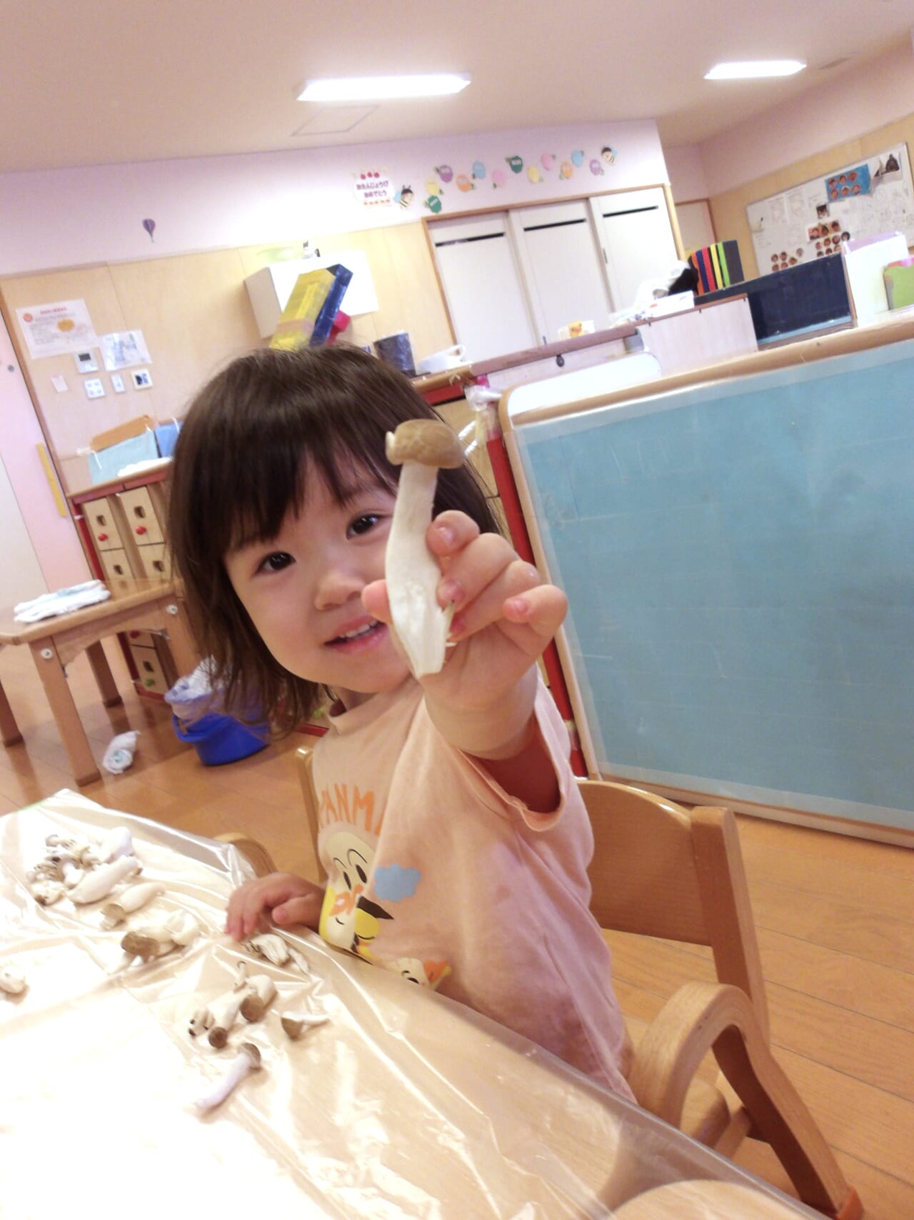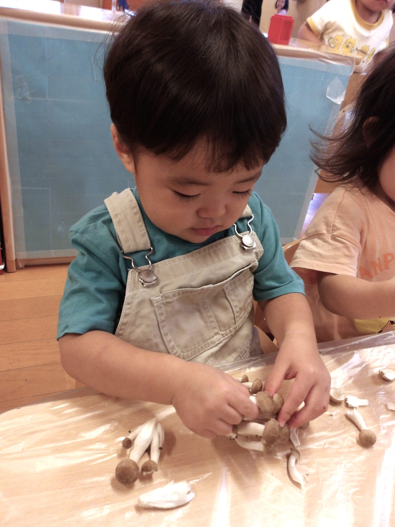 25日には、2歳児15人がこんにゃくちぎり、1歳児15人がしめじほぐしをお手伝い。こんにゃくに触れると「冷たい!」「ヘビみたい!」と笑顔に。コツをつかむと指先に力を入れながら上手に小さくちぎっていきます。しめじは、集中して一つひとつ丁寧にほぐしていました。