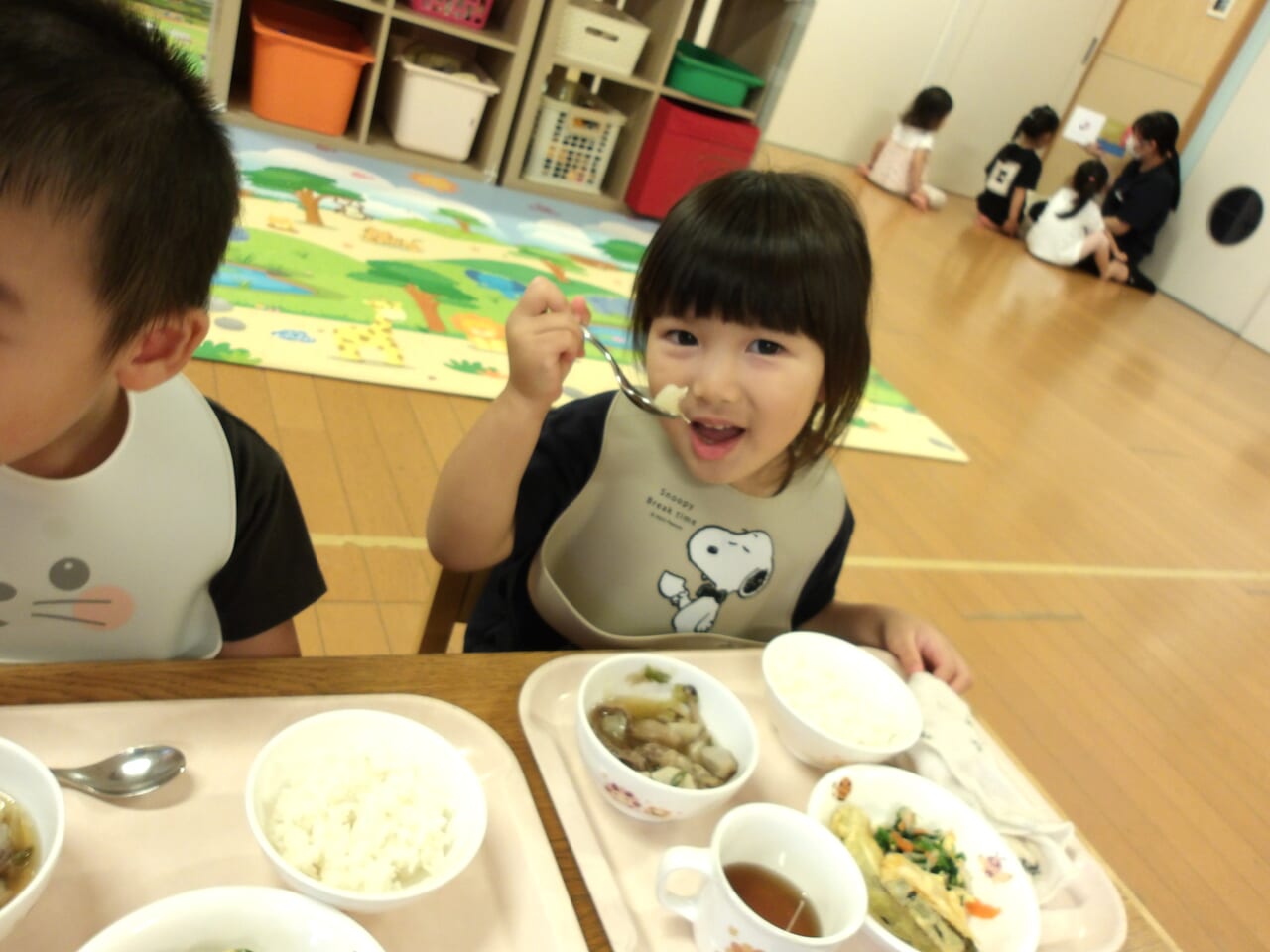 そして迎えた給食の時間、芋煮の中から里芋やこんにゃく、しめじを見つけると「見つけたよ!」とうれしそうに頬張る園児たち。芋煮作りに参加したことで、よりおいしく楽しく食べることができました。